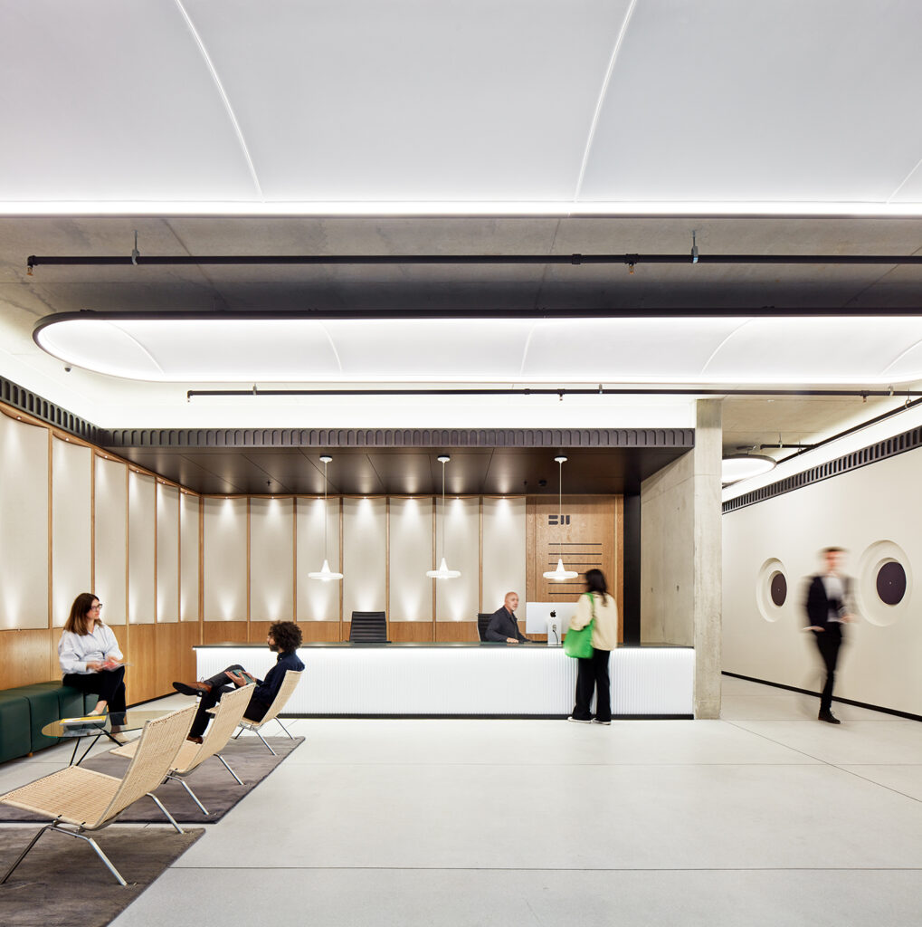 The entrance hall is an impressive, double-height space, with the upper level of the double-deck lifts accessed via mezzanines on either side of the reception area. Our highest grade Carrara marble was specified to clad the walls behind the reception, creating a sophisticated and dramatic backdrop, whilst also complementing the exposed concrete of the lift lobbies. The palette is cool and contemporary, with beautiful detailing.